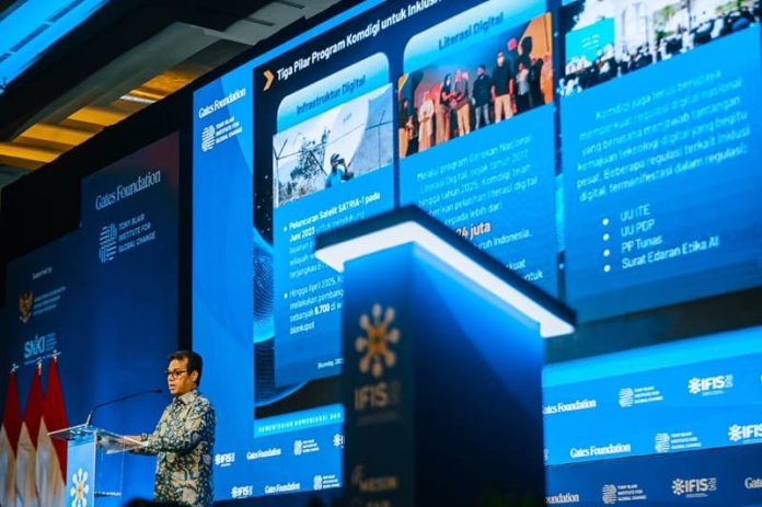 Wamenkomdigi Nezar Patria berbicara di acara Indonesia International Financial Inclusion Summit (IFIS) 2025: Financial Inclusion to Support Asta Cita di Grand Ballroom Kempinski, Jakarta Pusat (Foto: Komdigi)