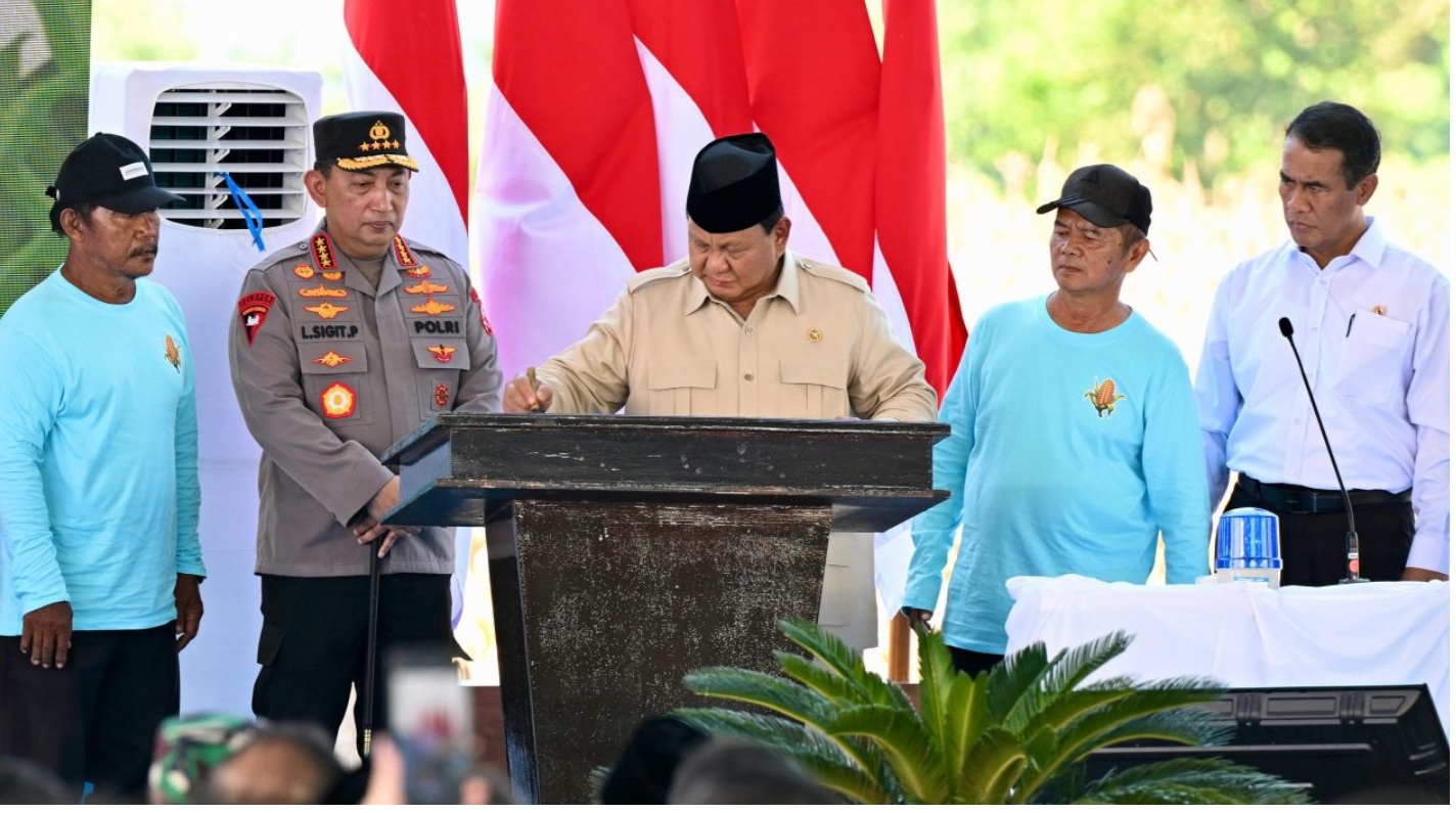 “Dengan mengucap bismillahirrohmanirrohim, pada siang hari ini Kamis, 5 Juni 2025, saya Prabowo Subianto, Presiden Republik Indonesia, dengan ini meresmikan Gudang dan Dryer Jagung PT Pangan Merah Putih,” ujar Presiden Prabowo saat peresmian.