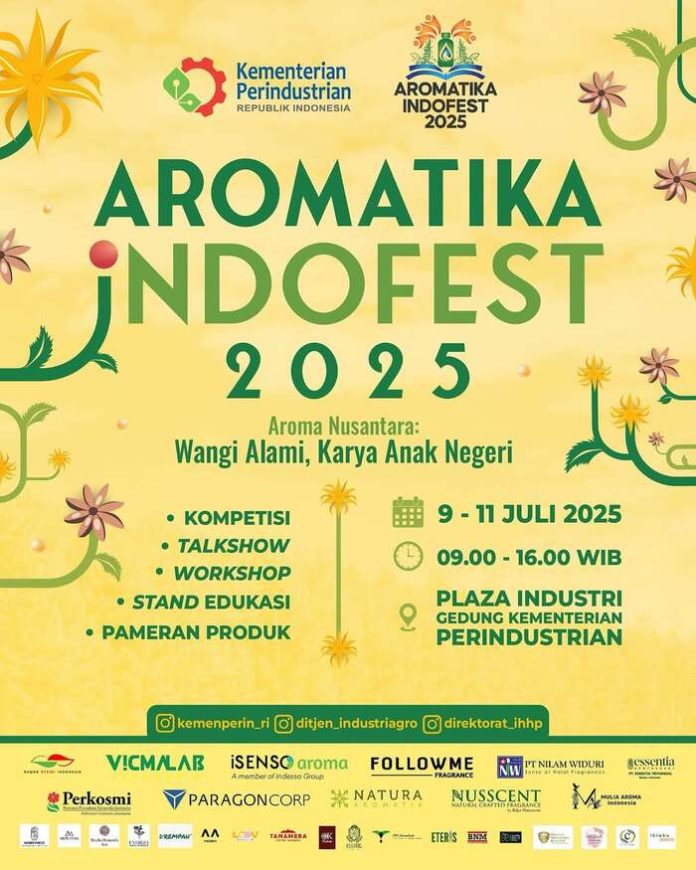 Sebagai upaya memperkuat ekosistem industri atsiri, pemerintah menggelar Aromatika Indofest 2025 pada 9–11 Juli 2025. Mengusung tema “Aroma Nusantara: Wangi Alami, Karya Anak Negeri”, festival ini menghadirkan pameran produk atsiri dari hulu ke hilir, talkshow, workshop, hingga kompetisi parfum berbahan lokal.