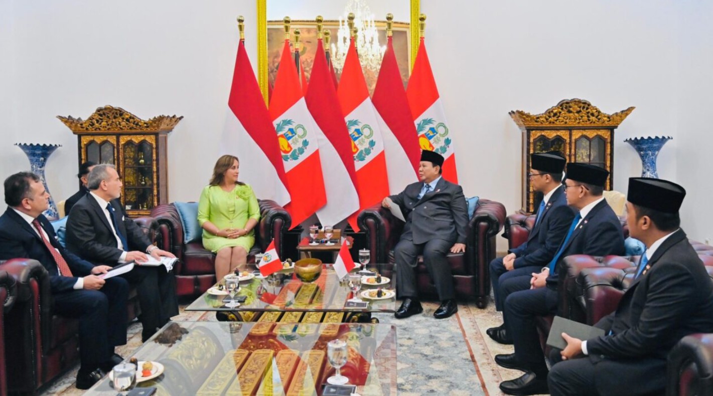 (Vibizmedia-Nasional) Presiden Republik Indonesia, Prabowo Subianto, menerima Presiden Republik Peru, Dina Ercilia Boluarte Zegarra, dalam pertemuan tête-à-tête di ruang kerja Istana Merdeka, Jakarta, Senin (11/8). Pertemuan ini menjadi bagian penting dari rangkaian kunjungan kenegaraan Presiden Dina Boluarte, yang bertepatan dengan peringatan 50 tahun hubungan diplomatik kedua negara.