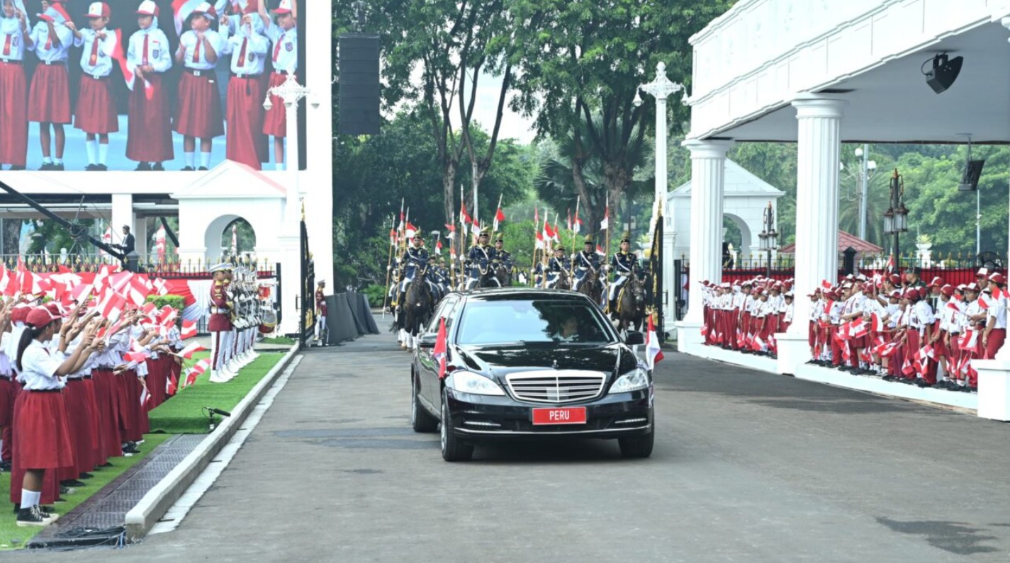 Kedatangan Presiden Dina Boluarte diawali iring-iringan meriah yang terdiri dari 17 pasukan motoris, 60 pasukan berkuda, pasukan jajar kehormatan, serta sekitar 3.000 pelajar yang mengibarkan bendera Merah Putih dan bendera Peru di sepanjang rute dari Monumen Nasional menuju Istana Merdeka. Kehadiran ribuan pelajar ini menambah semarak suasana sekaligus mencerminkan kehangatan sambutan rakyat Indonesia kepada tamu negara dari Amerika Latin tersebut.