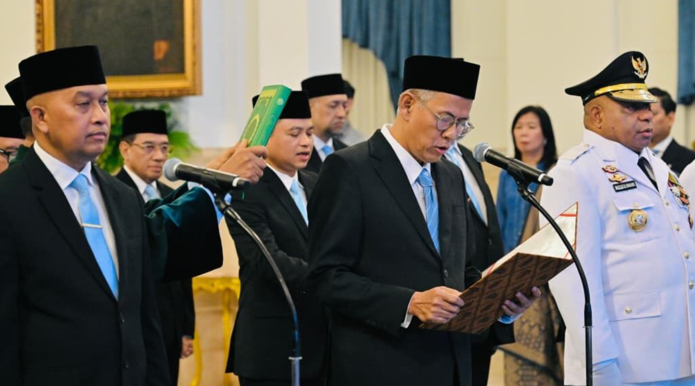 Dengan sikap tegap dan penuh khidmat, para anggota Dewan Komisioner mengucapkan sumpah jabatan di hadapan Presiden Prabowo, disaksikan oleh pejabat rohani dan para undangan.