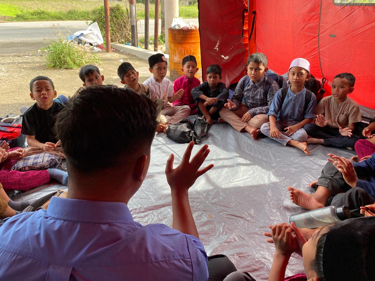 Sebagai solusi sementara, kegiatan belajar mengajar dilaksanakan di bawah tenda peleton yang disiapkan oleh BNPB bersama pemerintah daerah setempat. Tatap muka antara guru dan siswa pun berlangsung dengan suasana berbeda, namun tetap penuh semangat.