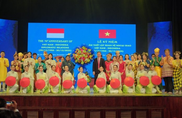 (Vibizmedia – Ho Chi Minh, Vietnam) Konsulat Jenderal Republik Indonesia (KJRI) di Ho Chi Minh City mendukung penuh penyelenggaraan perayaan 70 tahun hubungan diplomatik Indonesia–Vietnam (30 Desember 1955–30 Desember 2025) yang digelar dalam bentuk pentas seni dan budaya kedua negara. Acara tersebut diselenggarakan pada 19 Desember 2025 di gedung bersejarah Saigon Opera House, Ho Chi Minh City.