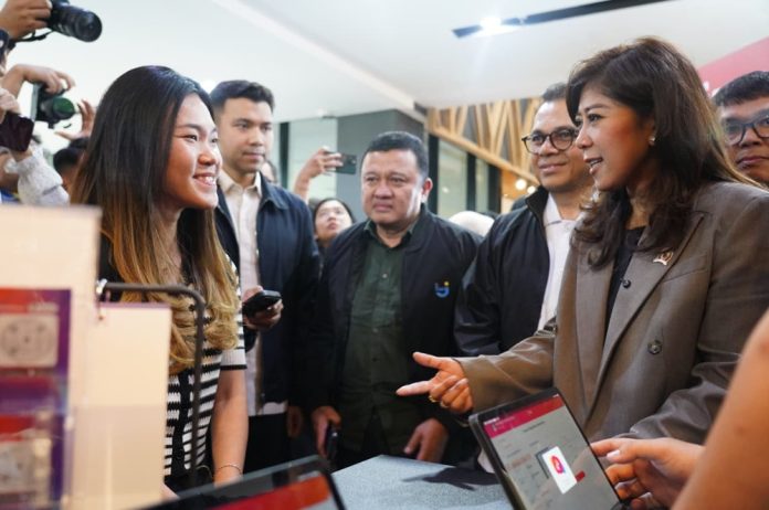 Menkomdigi Meutya hafid berbincang dengan seorang pendaftar sim card dengan sistem biometrik di kawasan Sarinah, Jakarta (Foto: Kemkomdigi)