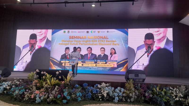Gubernur Banten Andra Soni membuka seminar 'Menakar Daya Ungkit KEK ETKI BSD sebagai Kutub Pertumbuhan Ekonomi Baru' di BSD City, Tangerang, Banten, Sabtu (7/2/2026). (Foto: Istimewa)