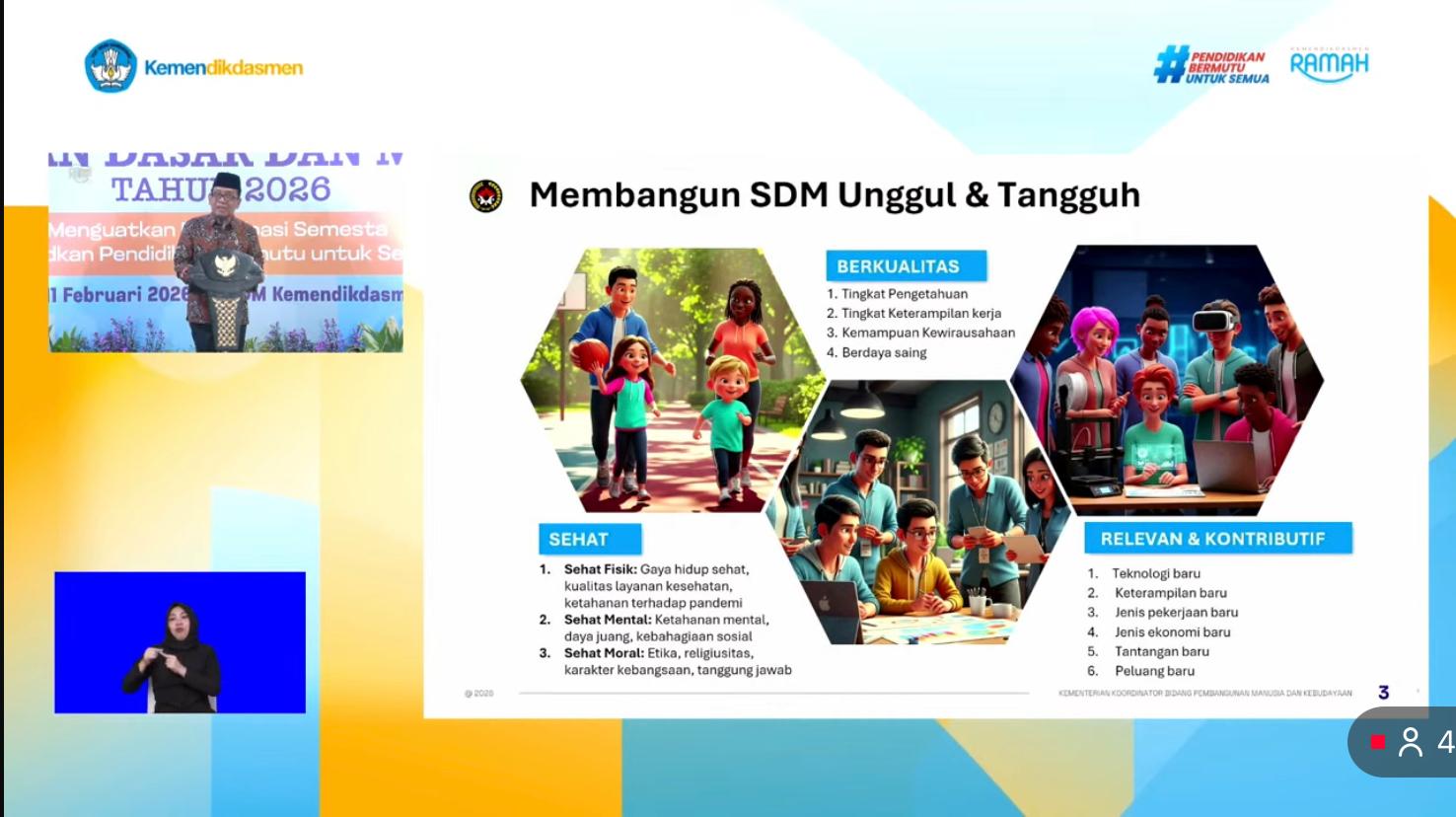 Ia menyampaikan bahwa pendidikan merupakan fondasi utama dalam agenda prioritas pembangunan SDM unggul. Hal ini sejalan dengan luasnya cakupan pembangunan manusia yang dikoordinasikan Kemenko PMK, mulai dari pendidikan, kesehatan, keluarga, pemuda, hingga kebencanaan.