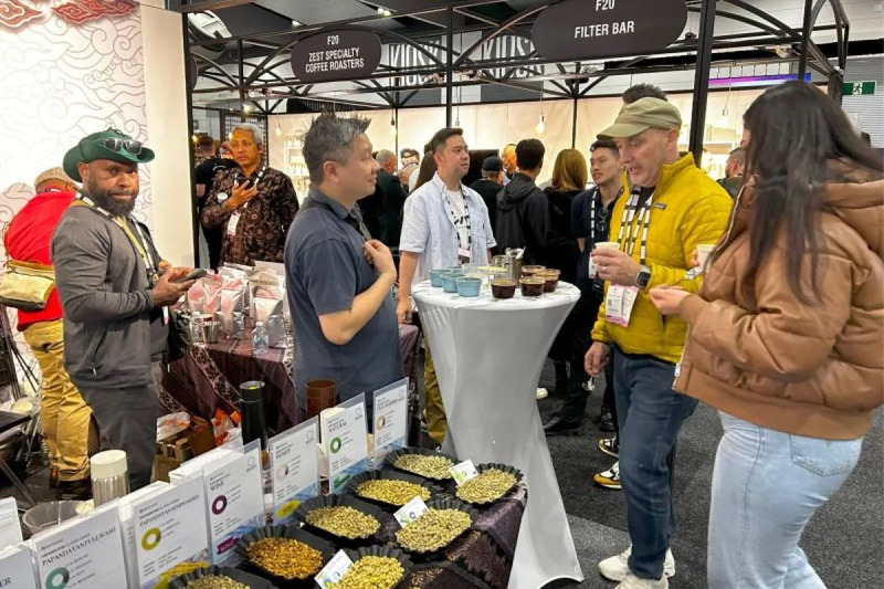 Salah satu gerai produk kopi Indonesia yang menjadi peserta dalam pameran Melbourne International Coffee Expo (MICE) di Melbourne, Australia pada Selasa (14/5/2024). (Foto: Kemendag)