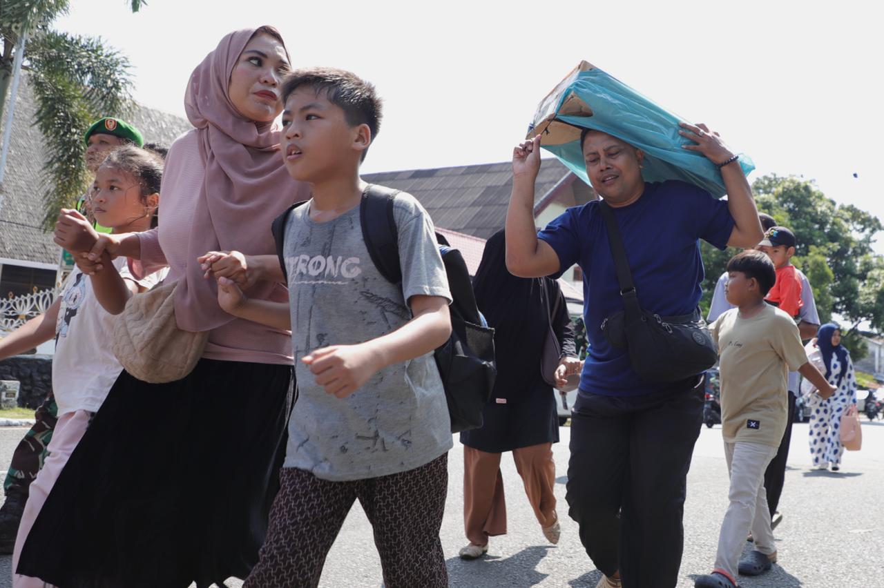 Warga termasuk ibu dan anak-anak bergegas menyusuri jalan menuju lokasi pengungsian sambil membawa perlengkapan darurat dalam simulasi evakuasi bencana banjir sebagai bagian dari puncak peringatan HKB 2026 di Kecamatan Baiturrahman, Kota Banda Aceh, Minggu, 26 April 2026. FOTO: BNPB