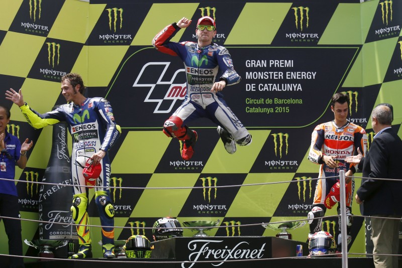 Merayakan Kemenangannya Jorge Lorenzo Melompat Diatas Podium