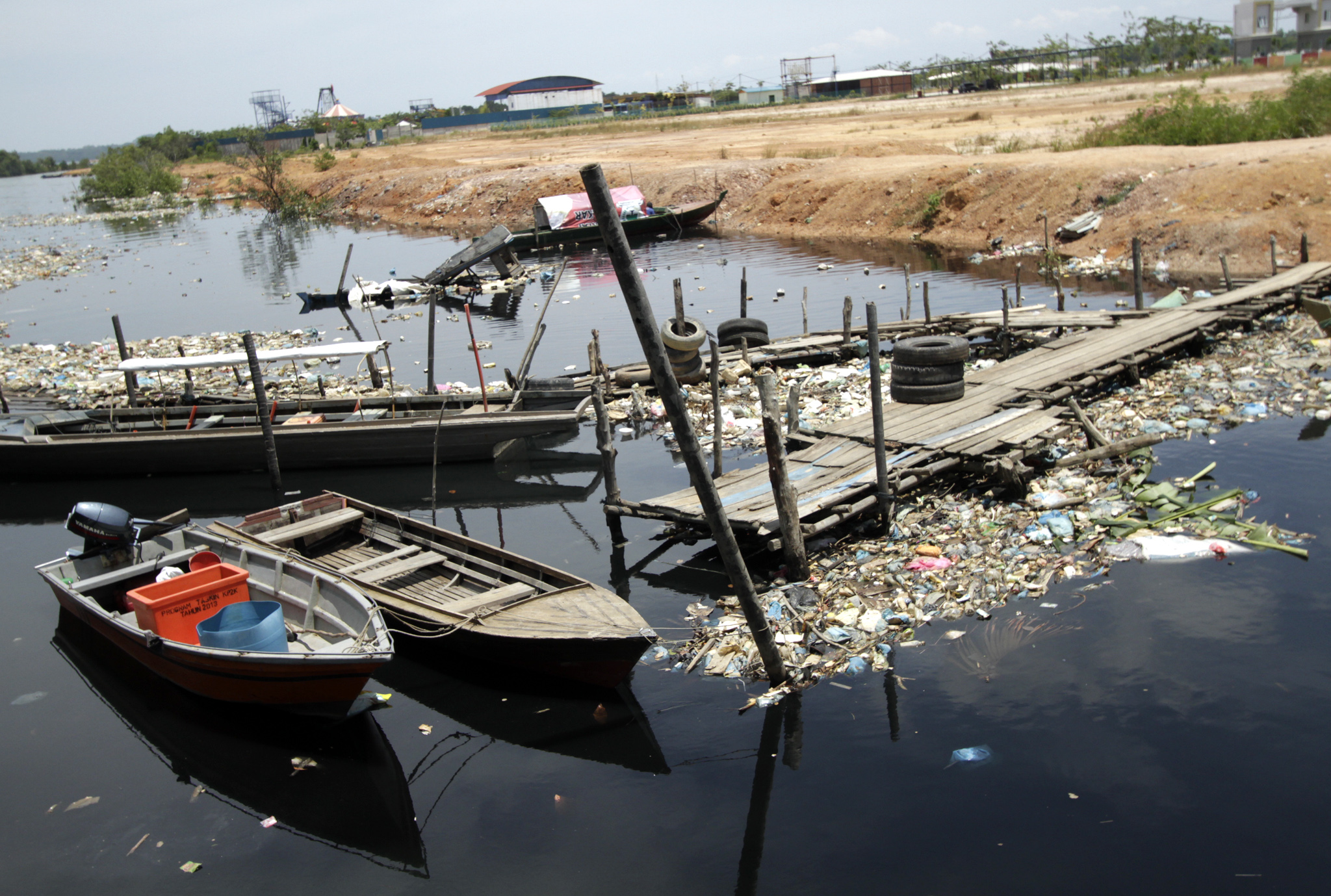 Sejumlah sampan ditambatkan di sungai yang airnya telah terkena intrusi air...
